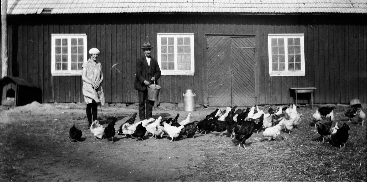 Ett par matar en stor skock hönor på gården. Till vänster syns även en hundkoja. Taket är belagt med flacktegel.
