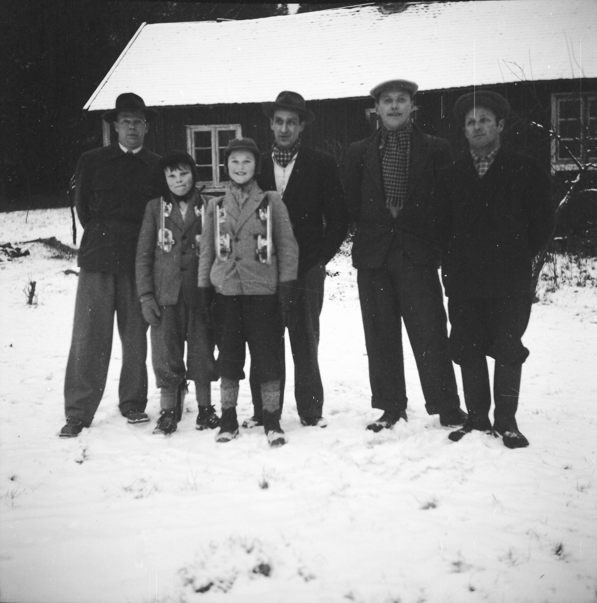 Två pojkar med skridskoskenor om halsen står omgivna av fyra män i snön utanför en stuga, troligen i Börsgård då en person anges vara Åke i Börsgård. Längs till höger står Viktor på Storåker och bredvid honom "Målar-Anders".