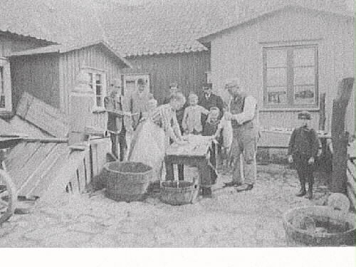 Bilden tagen hos laxfiskaren och rökaren Algernon Stenberg (till höger i bild med keps, vit skjorta och väst). Hans fru Tekla Stenberg rensar fisk, omgiven av laggade kar. Bakom dem syns barnen Carl, Bror och Jacke Stenberg.