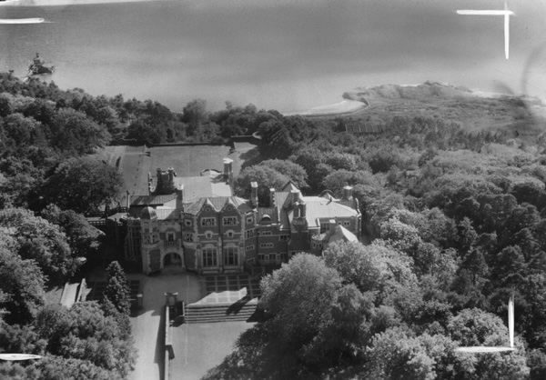 Flygbild över Tjolöholms slott på låg höjd, avsedd att beskäras till vykort (därav markeringarna). Vy över Tjolöholms slott med park och trädgårdar, sett från landsidan ut över havet. Till vänster ses en brygga ut till ett bad- och båthus.