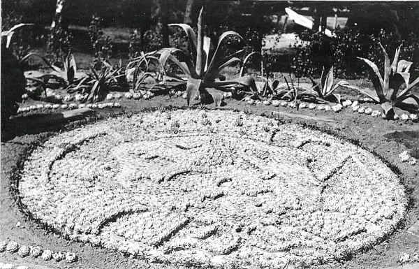 Kaktusplanteringen i Varbergs järnvägspark som detta år uppvisar en medaljong med Hallands vapen så det bör vara 1953. På bild 2 ses t h stadsträdgårdsmästare Oscar Johansson och en medarbetare i planteringen.