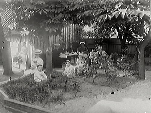 Kaffedrickande på en stadsinnergård i skuggan under en kastanj. I förgrunden sitter barn på en upphöjd gräsyta. Plank sträcker sig från husknuten.