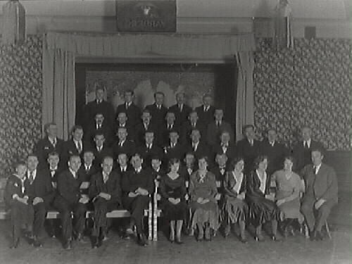 Svenska Handelsanställdas förbund, avd. 70, Varberg församlade i en sal med liten scen. En liten pojke sitter i knät på mannen längst till vänster.