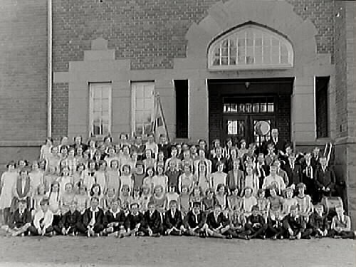Sångkören och gosskören under ledning av Axel Österberg. "Unga röster". 1:a raden från vänster: Gösta Svensson, Bror Svensson, Bertil Bengtsson, Bertil Rignell, John Henry Johansson, Olle Eriksson, Carl Svensson (Svenring), Valter Berg, Stig Johansson, Lennart Nilsson, Rolf Johansson, ?, Bertil Dahlin, Stig Johansson, Artur Svensson, Uno Dahl. 2:a raden: ?, Anna Johansson, Lilly Eliasson, ?, Inga-Greta Andersson, Elsa Karlsson, Maj Hallén, Inga Martinsson, Harriet Stenberg, Anna-Lisa Larsson, Lizzie Johansson, Britt Östlin, Märta Johansson, Olga Bengtsson, Sally Andersson, Kerstin Johansson, Ebba Axelsson, ?, Margit Pramwall, Ingrid Hallberg, ?,. 3:e raden: ?, Birgit Johansson, Vera Andersson, Margit Johansson, Rut Bengtsson, Gunda Fritzman, Stina Hultin, Inga-Greta Larsson, Maj Friberg, Lizzie Johansson, Lizzie Hjalmarsson, Bengtsson, Elsa Martinsson, Anna-Lisa Hallberg, Anna-Lisa Bengtsson, Elsa Salomonsson, Ragna Pihl, ?, Linnea Strandberg, Anna-Lisa Andreasson, Lasse Larsson. 4:e raden: Junis Olausson, ?, Gullan Bengtsson, Wanja Eliasson, Ann-Mari Österberg, Vanja Pettersson, Maj Olsson, Iris Nilsson, Ingegärd Granat, Gunvor Kjellström, Eva Berg, Signe Berntsson, Karin Mossberg, Lilly Larsson, Greta Pålsson, Karin Johansson, Kerstin Bartholdsson, Gertrud Carlsson, Lalle Eliasson, Lillebror Sörström, Nisse Nilsson, Ivar Hjalmarsson, Erik Karlsson(?). 5:e raden: Greta Hallberg, Gulli Nilsson, Ruth Gunnarsson, Ella Bengtsson, Asta Börjesson, Greta Nord, Ruth Helin, Margareta Johansson, Karl-Eriik Weddig, Arne Johansson, Gunnar Dahlin, Ivar Samuelsson, Sven Johansson, Tage Svensson, Nils Svensson, Rosa Eliasson, Kerstin Svensson, Evy Helin, Lolle Olsson, Astor Boman, Ove Eliasson, Gösta Appelgren. Körerna är fotograferade framför Rosenfredsskolans entré.
