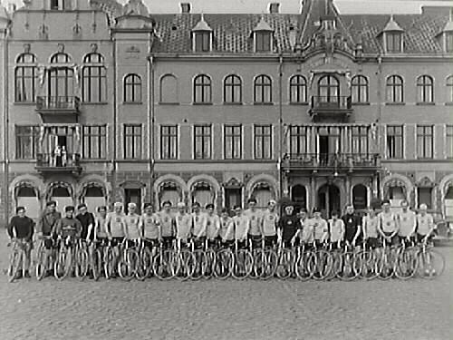 "Cykelklubben Star har en klubbtävling. Cyklisterna har radat upp sig på Varbergs torg framför Stadshotellet. Från vänster: Bertil Karlsson, Gunnar Ottosson, Sixten Bengtsson, Gustav-Adolf Eklund 'Kungen', Nils Nilsson, Gunnar Andersson, Gustav Svensson, Bror Johansson 'Skomakarn' (ägare till 'Brors skor'), Bror Karlsson, Allan Nilsson, Arit Svensson, ?, Gunnar Persson el. Karl-Erik Persson (bröder), Gustav Gustavsson, Erik Andersson 'Kocken', Ernst Andersson, Knut Bernandersson 'Baggen', Sven Liljegren, Åke Johansson, Per Persson, Åke Andreasson 'Skrälla', Göte Blomqvist, Sven Johansson 'Sven J-B', Bror Andersson, Vilhelm Paulsson. OBS klockorna på armen som användes för att kolla tiden. De små är vanliga armbandsklockor medan de större är gamla fickur som man köpt speciella fodral till. De var större och därmed bättre att se tiden på."