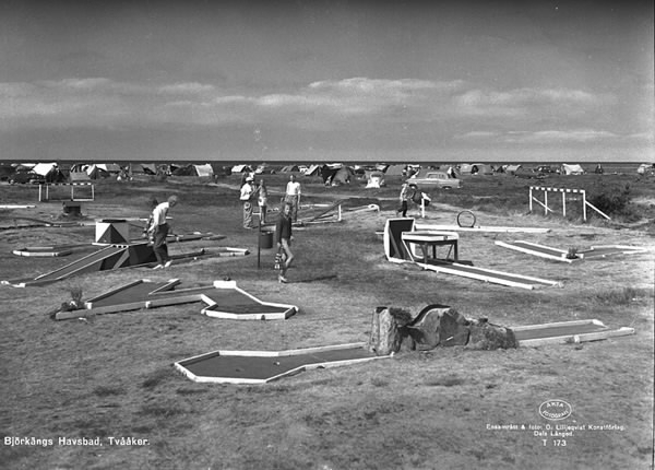 Vykort, "Björkängs Havsbad, Tvååker." Några personer spelar minigolf, i bakgrunden campingsplats.
