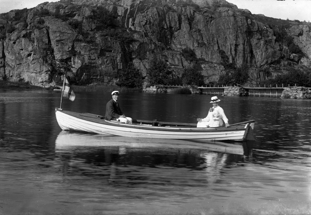 En finklädd familj på båttur med anordning för laxfisket vid Åsbro i bakgrunden och ett brant berg. I aktern sitter en kvinna i hatt med ett litet barn och styr båten. I fören sitter en man i skärmmössa och längst fram är en flagga monterats.
