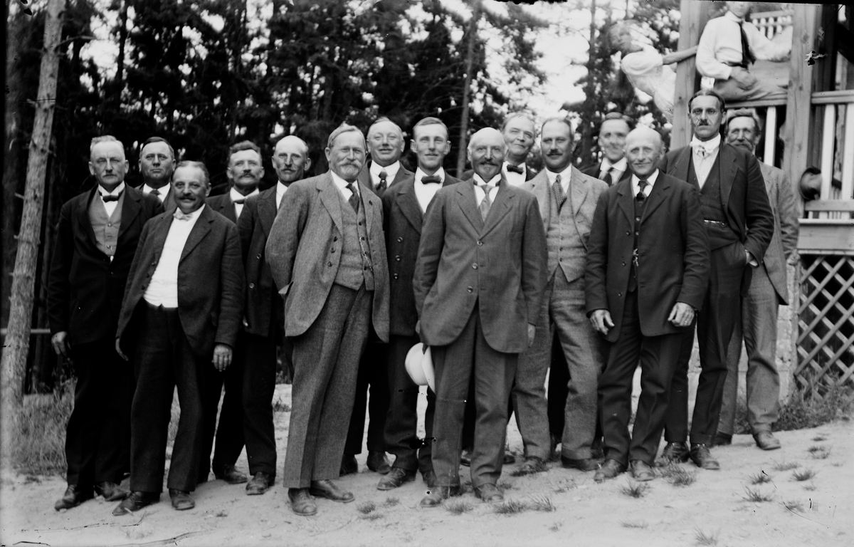 Femton nämndemän i Viske häradsrätt står på sandig mark vid en byggnad. Flera av herrarna bär fluga. Ett par barn sitter uppe på verandastaketet till höger. Tingshuset låg i Nyebro, Värö, så förmodligen är fotot taget där.