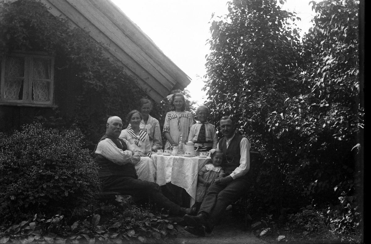 Vuxna och barn samlade kring ett kaffebord vid gaveln till en låg stuga, Lilla Gunnels i Sällstorp. Mannen till vänster heter Ahlgren. Uteplatsen är lummig, omgiven av höga syrenbuskar, en frodig klängväxt på husgaveln och annan växtlighet. Pojkens byxor hålls uppe av ett resårskärp, mannen till höger har en småmönstrad skjorta med ståkrage och ett par av klänningarna har detaljer av ett bredrandigt tyg. (Se även bild nr GEA132)