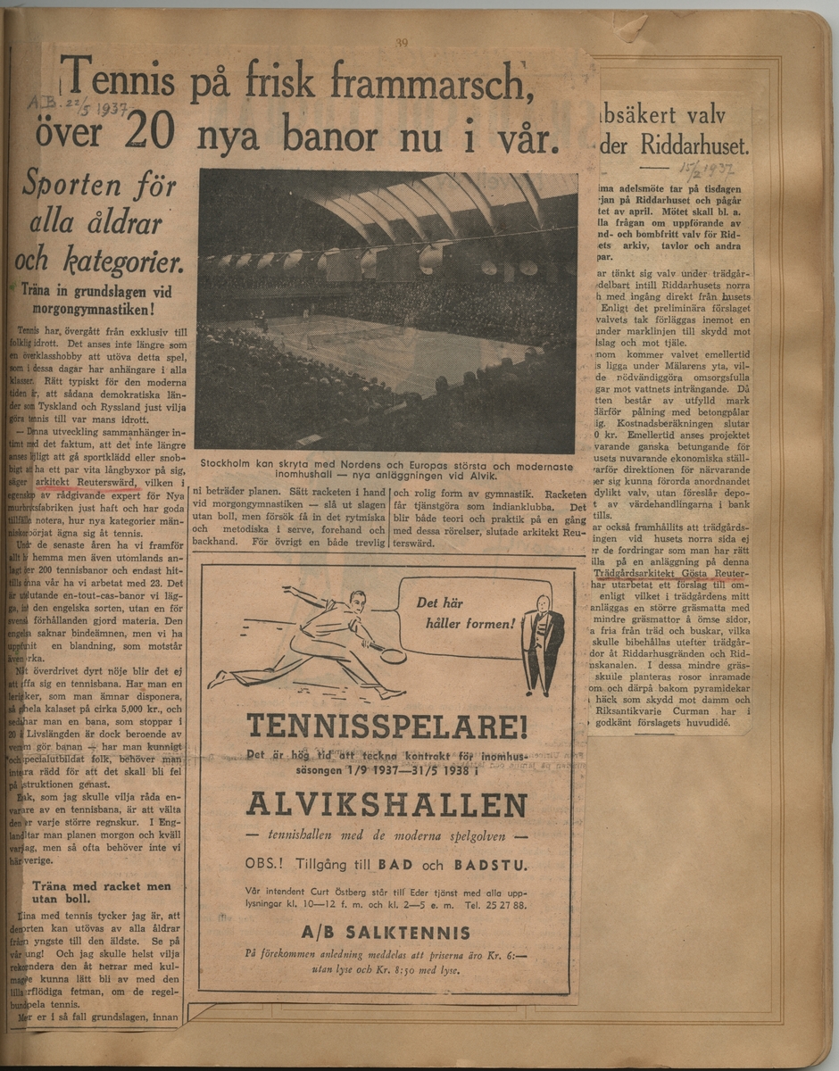Aftonbladet, 22-05-1937: Tennis på frisk frammarsch, över 20 nya banor nu i vår.