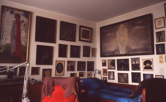 Foto från Hanna Bauers lägenhet i Jönköping 1982, med John Bauers konstverk på väggarna.
