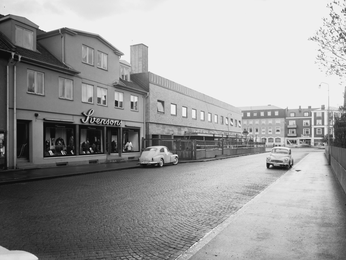 Drottninggatan i Huskvarna till vänster ser man gaveln av det nybyggda varuhuset EPA. 12 juni 1962.