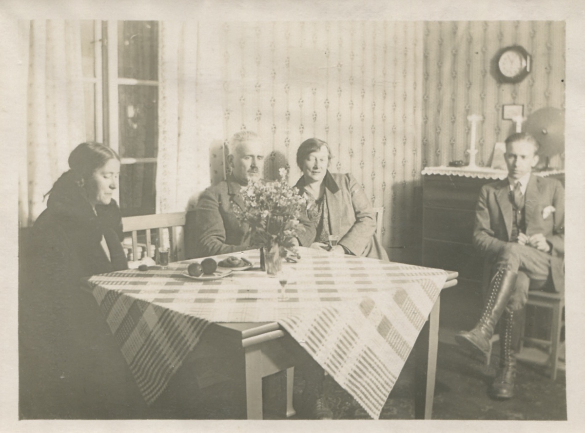 Fyra personer sitter vid ett bord i ett kök/rum, okänd plats och årtal. Foto från Sagered-album.