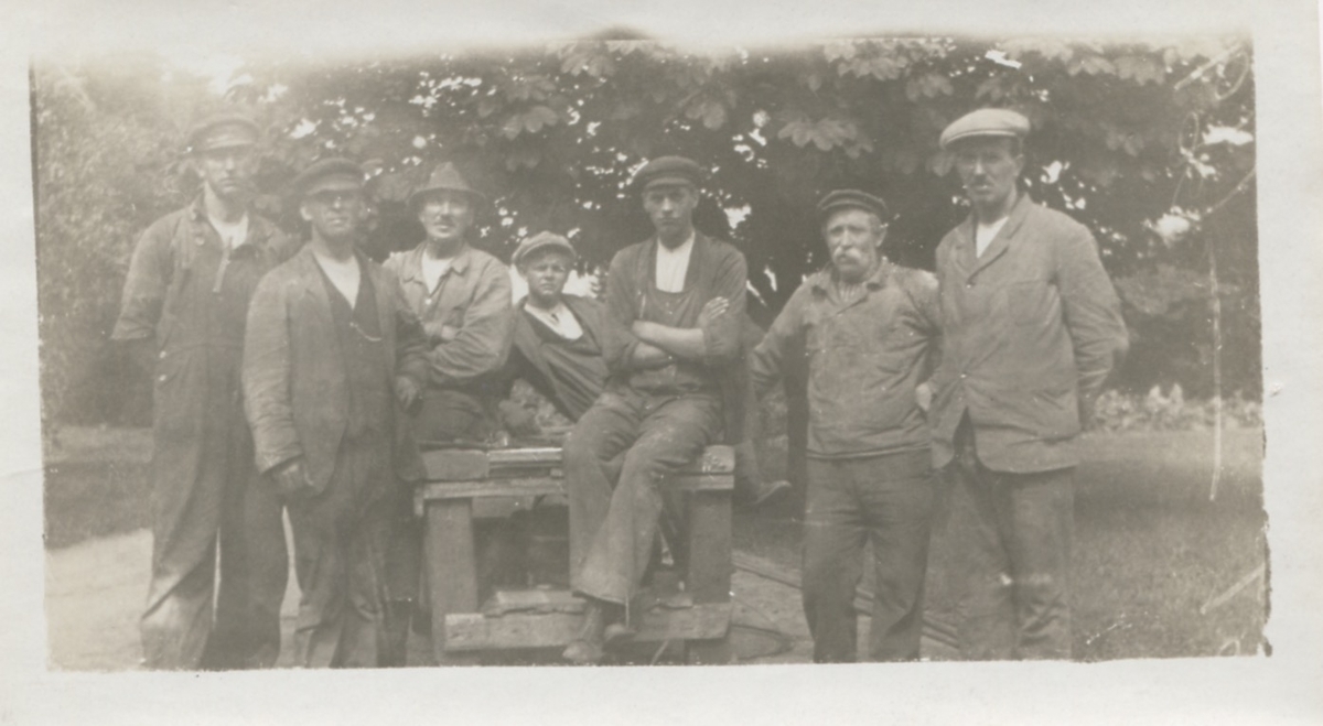 Sju män står uppställda framför en häck, okänd plats och årtal. Troligen anställda personer vid "Sandbergs" gård. Foto från Sagered-album.