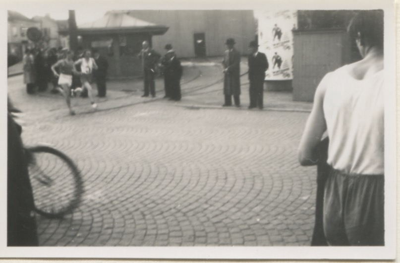 Löpartävling på gatstenarna i Mölndals bro, okänt årtal.