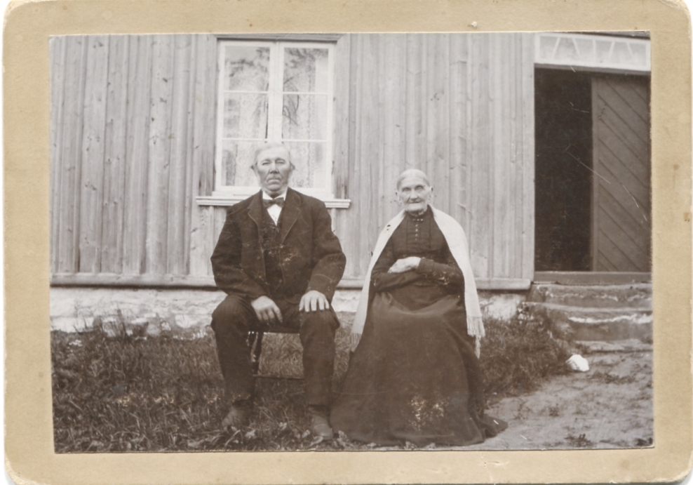 Ett okänt äldre par sitter framför en byggnad, okänt årtal och plats. Eventuellt Hilda Sandbergs fosterföräldrar från Hjärtum eller Anders och Robert Sandbergs släktingar i Lindome. Foto från Sagered-album.