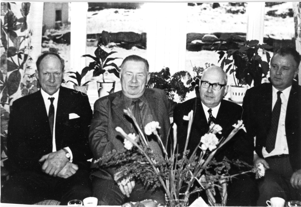 Brandkåren uppvaktar Sven Svensson som fyller år, okänd plats och årtal. I soffan sitter: 1. Sven Svensson. 2. Åke Stenström. 3. Ewald Gustafsson. 4. Egil Jönsson