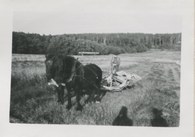 En man plöjer åkern med hjälp av av två arbetshästar, "Sandbergs" Sagered 3:3 1940-tal.
