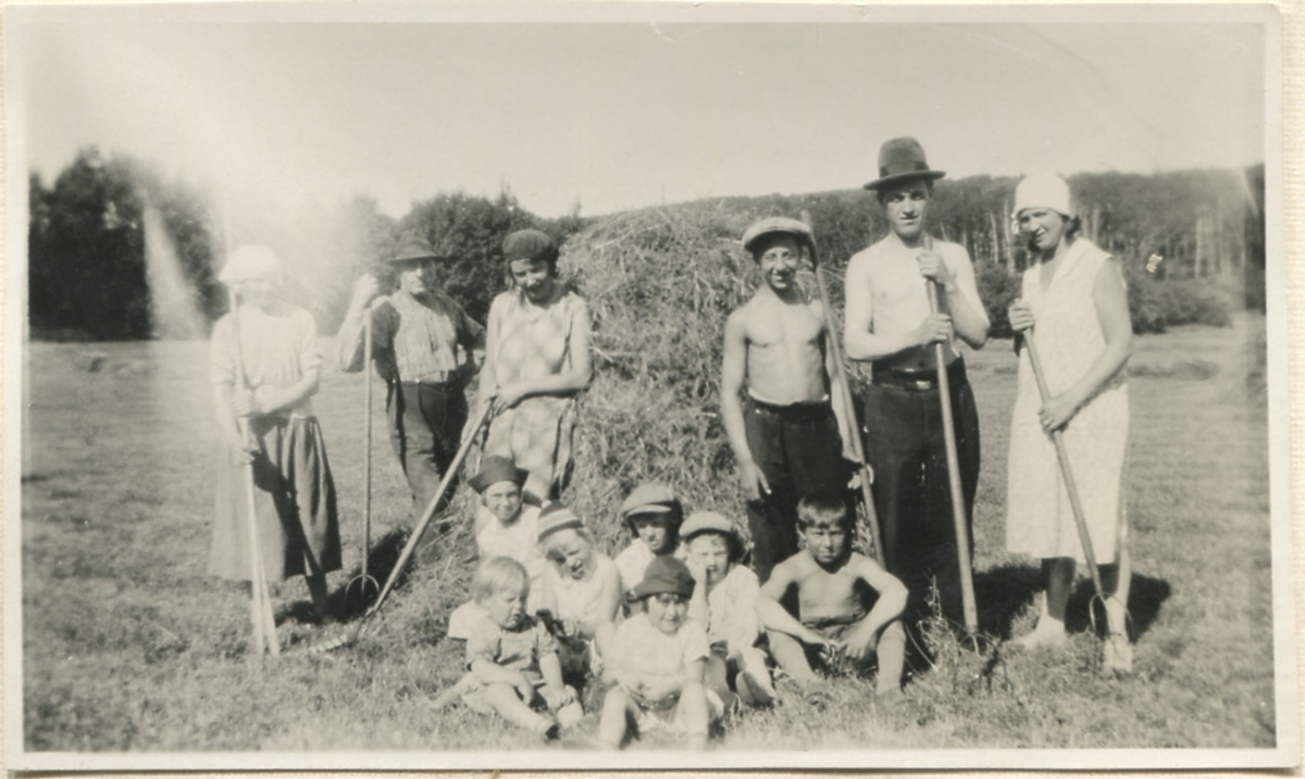 Flertalet personer hjälper till med höbärgning på åkrarna, "Sandbergs" Sagered 3:3 1950-tal.