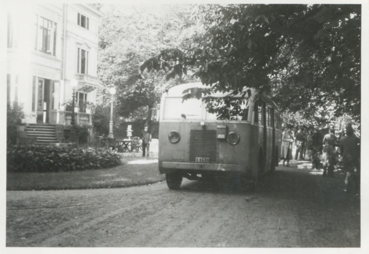 En buss står framför en stor byggnad, troligtvis Thorskogs Slott, okänt årtal. Hilda Sandberg (född Olsson) arbetade i köket på slottet innan hon arbetade som husa hos Håkan Jönsson i Stretered.