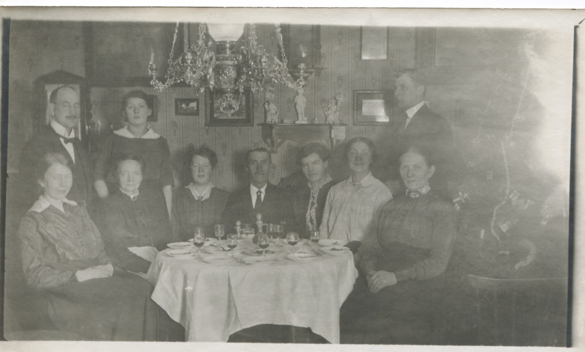 Bjudning i ett välbärgat hem där personer sitter samlade runt ett bord, okänd plats 1910-1920. Femte person från vänster: Hilda Sandberg (1887-1973, född Olsson).