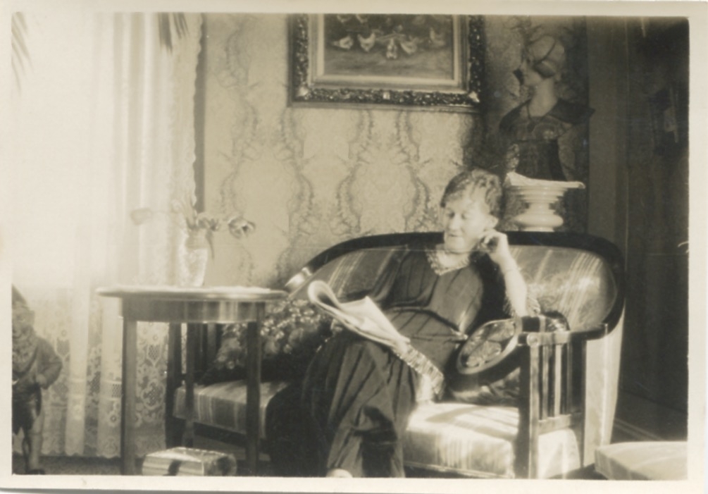 Annette "Anna" Jönsson (född 1865 Tjörnarp), gift med Håkan Jönsson som var rektor på Stretereds skolhem, sitter och läser i ett rum i Rektorsvillan i Stretered där paret bodde, okänt årtal.