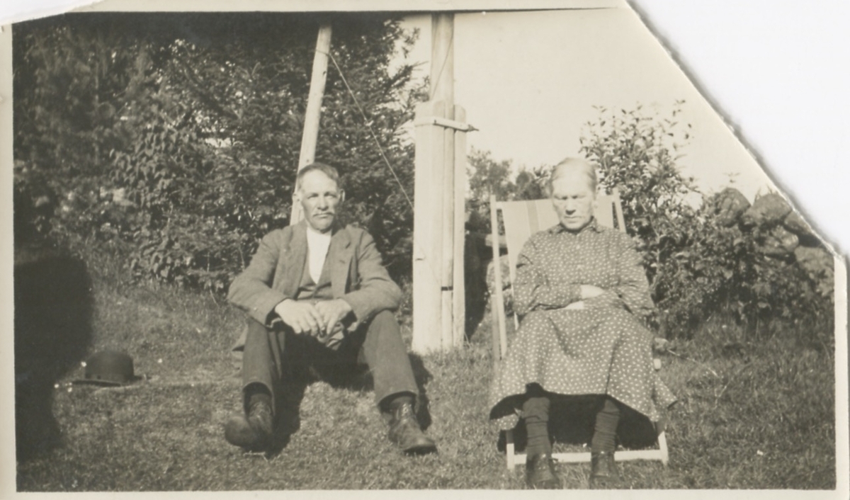 Ett gift par sitter på gräsmattan, Lilla Vommedal (nu: Streteredsvägen 25) okänt årtal. Anton Gustafsson (1873 - 1948) och hustrun Maria Gustafsson (1858 - 1944). Anton var född i Romelanda och Maria var född på gården.