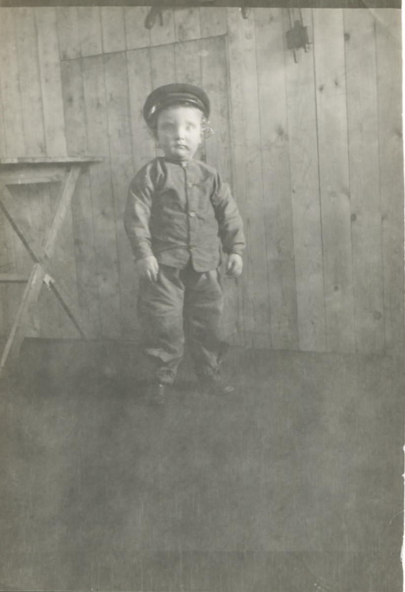 Lille Axel Valdemar "Lasse" Bengtsson utanför bostaden Högbo på Gamla Riksvägen 81 (då 79) i Kållered, cirka 1913-1914. Son till Ida (född i Bölet 1894 - 1965) och Johannes Bengtsson (1873 - 1942).