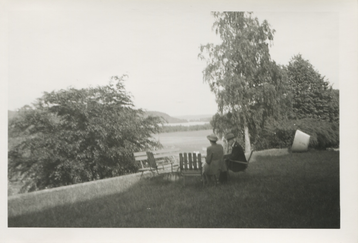 Hilda (1887-1973, född Olsson) och Anders Sandberg (1873-1951) från Sagered 3:3 är på utflykt till Rossareds herrgård i Halland (Fjärås i Kungsbacka), 1940-tal. Paret sitter i solstolar på en gräsmatta och ser ut över nejderna.