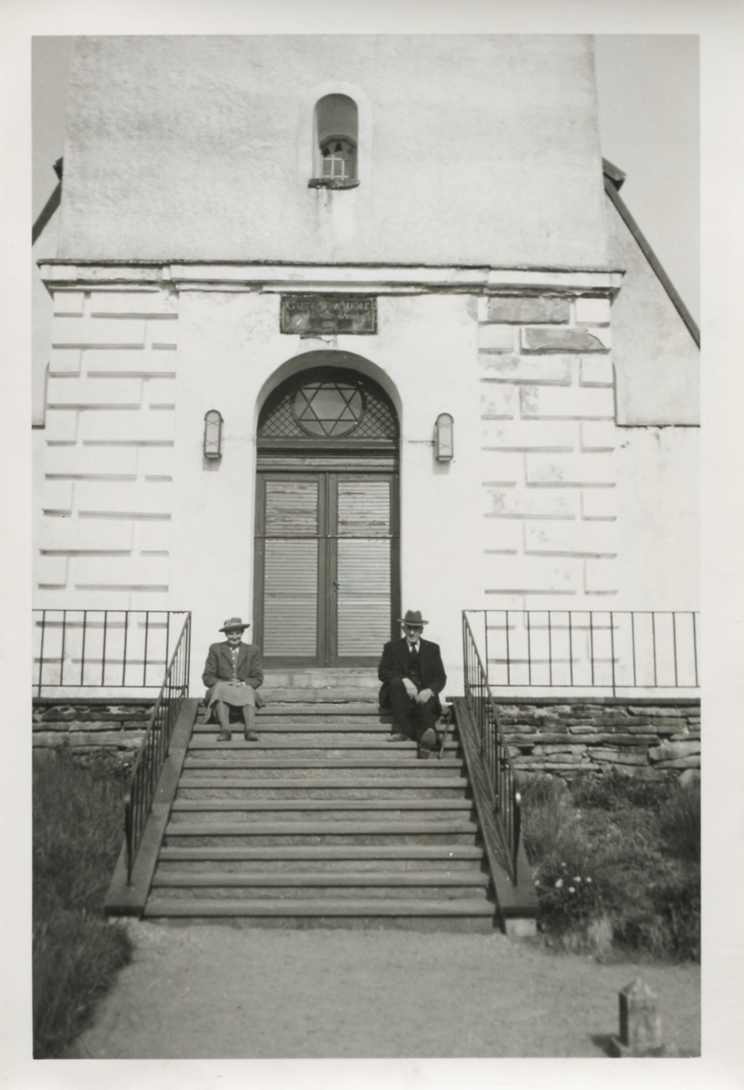 Hilda (1887-1973, född Olsson) och maken Anders Sandberg (1873-1951) från Sagered 3:3 sitter på trappan in till Hjärtums kyrka i Lilla Edet, 1940-tal. De är på utflykt till Hjärtum där Hilda var fosterbarn.