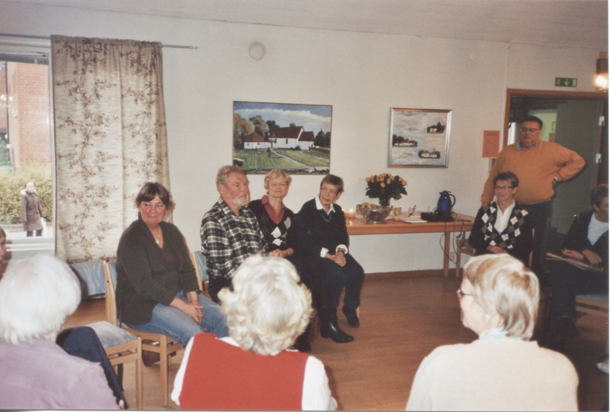Berättarcafé om Kållereds Gymnastikförening 1958 - 2008 i Församlingshemmet 2007. Från vänster: 1. Greta Nilsson (delvis skymd). 2. Kicki Magnusson Molander. 3. Berny Gustafsson, Bölet. 4. Margit Hellström, Bölet. 5. Karin Gustafsson, Bölet. 6. Anita Alriksson, ordf. 7. Staffan Bjerrhede (stående). I bakgrunden skymtas en tavla av Kållereds gamla kyrka.
