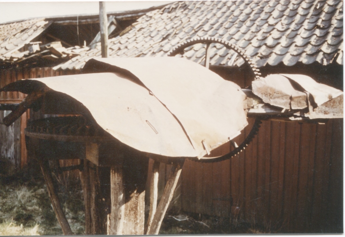 Apelgården 1:3 "Efraims" 1970-tal. Tröskvandringen som nu finns på Hembygdsgården Långåker. Gunnel Dahlbeck hämtade den på 1970-talet och körde den till Tulebo när ladugården revs. Senare fick Hembygdsföreningen den som gåva.