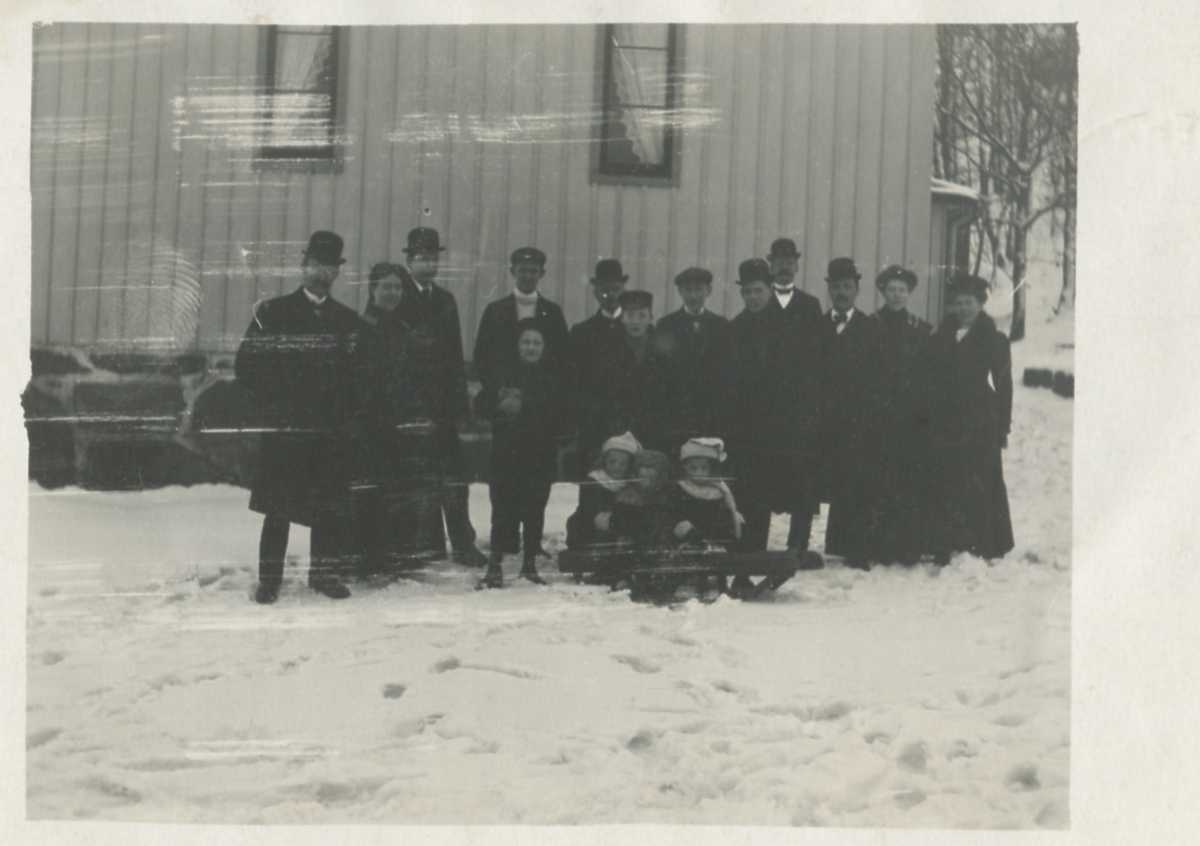 Församlingen står uppradad framför Missinshuset på Labackavägen. Vykort sänt från Göteborg 1910 till Judith Eriksson i Bölet. I bakgrunden ses Gamla Missionshuset som 1922/23 ersattes av Kållereds Missionskyrka (nuvarande Ekenkyrkan).