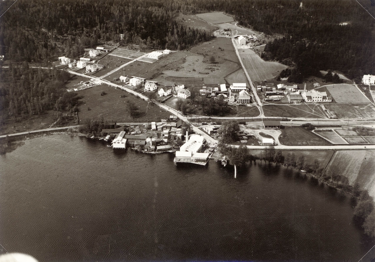 Parti av Virserums samhälle med träindustri och Virserumssjön i bakgrunden.
