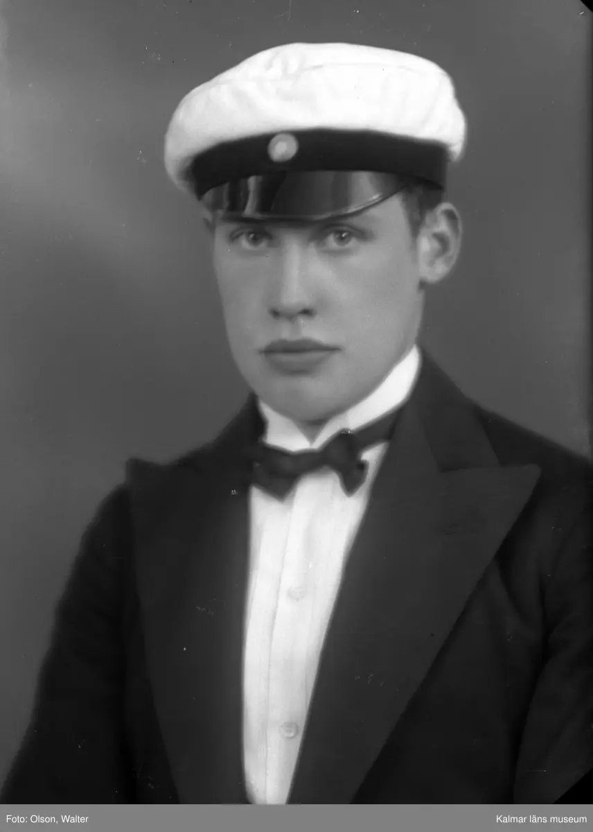Ateljébild på en man som har tagit studenten. Enligt Walter Olsons journal är bilden beställd av C G Wiman.