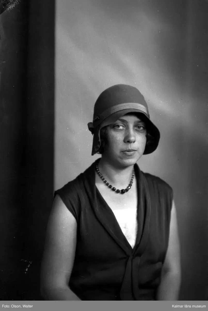 Ateljébild på en kvinna i hatt och klänning. Beställare till bilden: Fröken Jonsson ifrån Kalmar.
