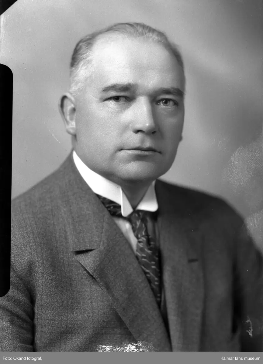Ateljébild på en man med kostym och stärkkrage. Beställare till bilden: Lärare O Gustavsson ifrån Kalmar.
