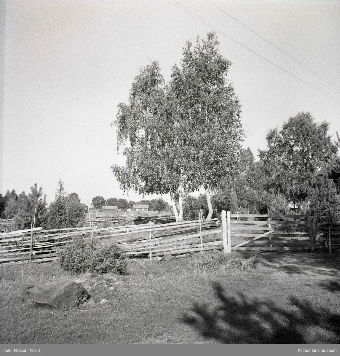 Karl Nilssons gård i fonden. Björk och grind i förgrunden.