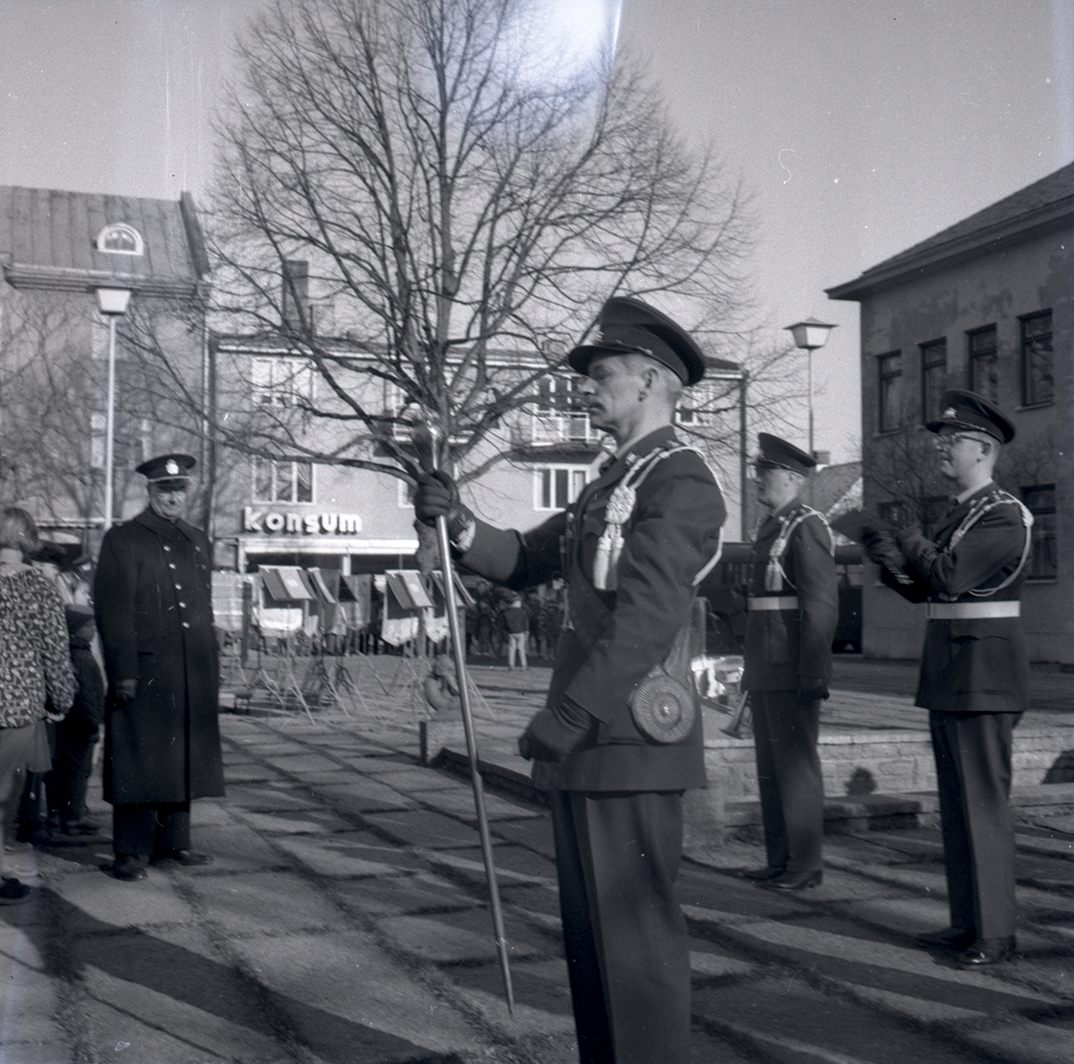 Finalen av militärövningen Ölandskriget. En soldat med stav för tamburmajor på torget i Borgholm.