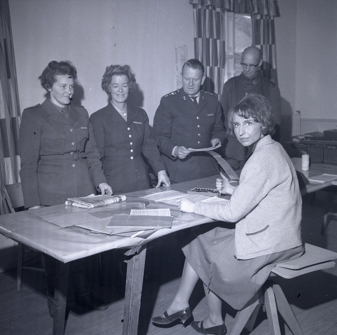 Bild i samband med militärövningen Ölandskriget. Två befäl, två lottor och en civil kvinna vid ett bord.