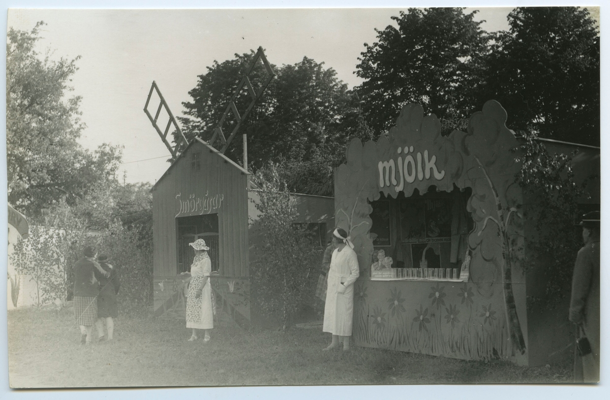 Marknadsstånd, försäljning av smörgåsar och mjölk.