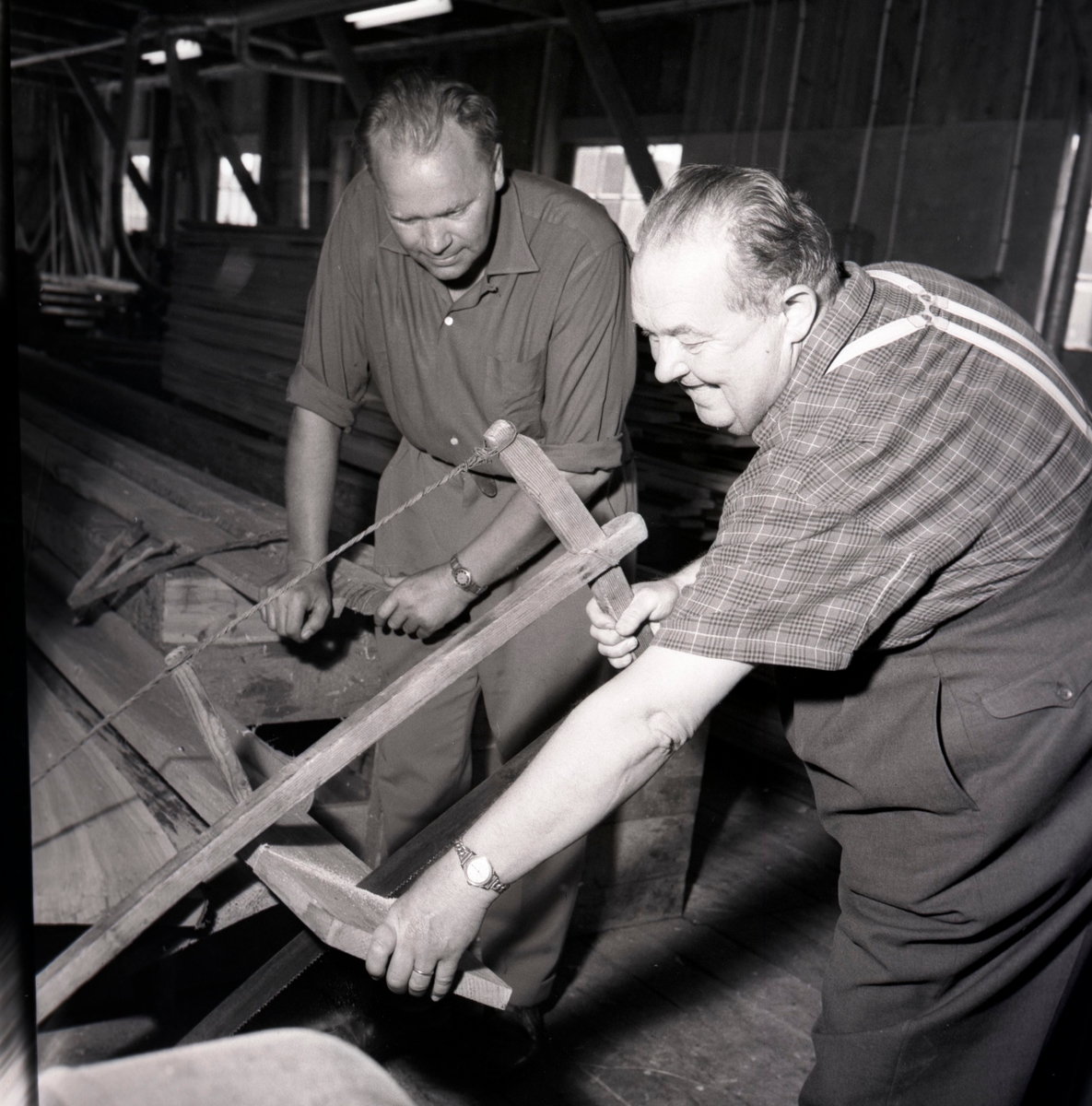 TV-Levis, sågar träplankor, på uppdrag av Hylands Hörna.