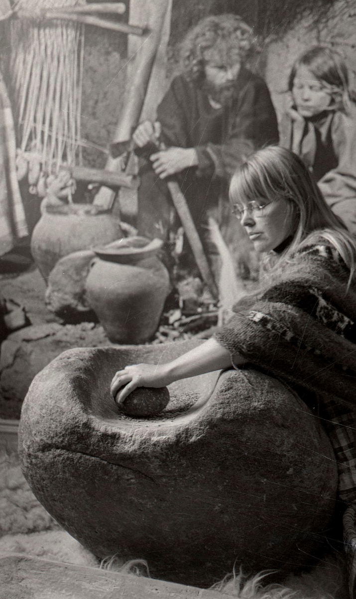 Birgitta Marnung demonstrerar hur man malde säd på stenåldern.