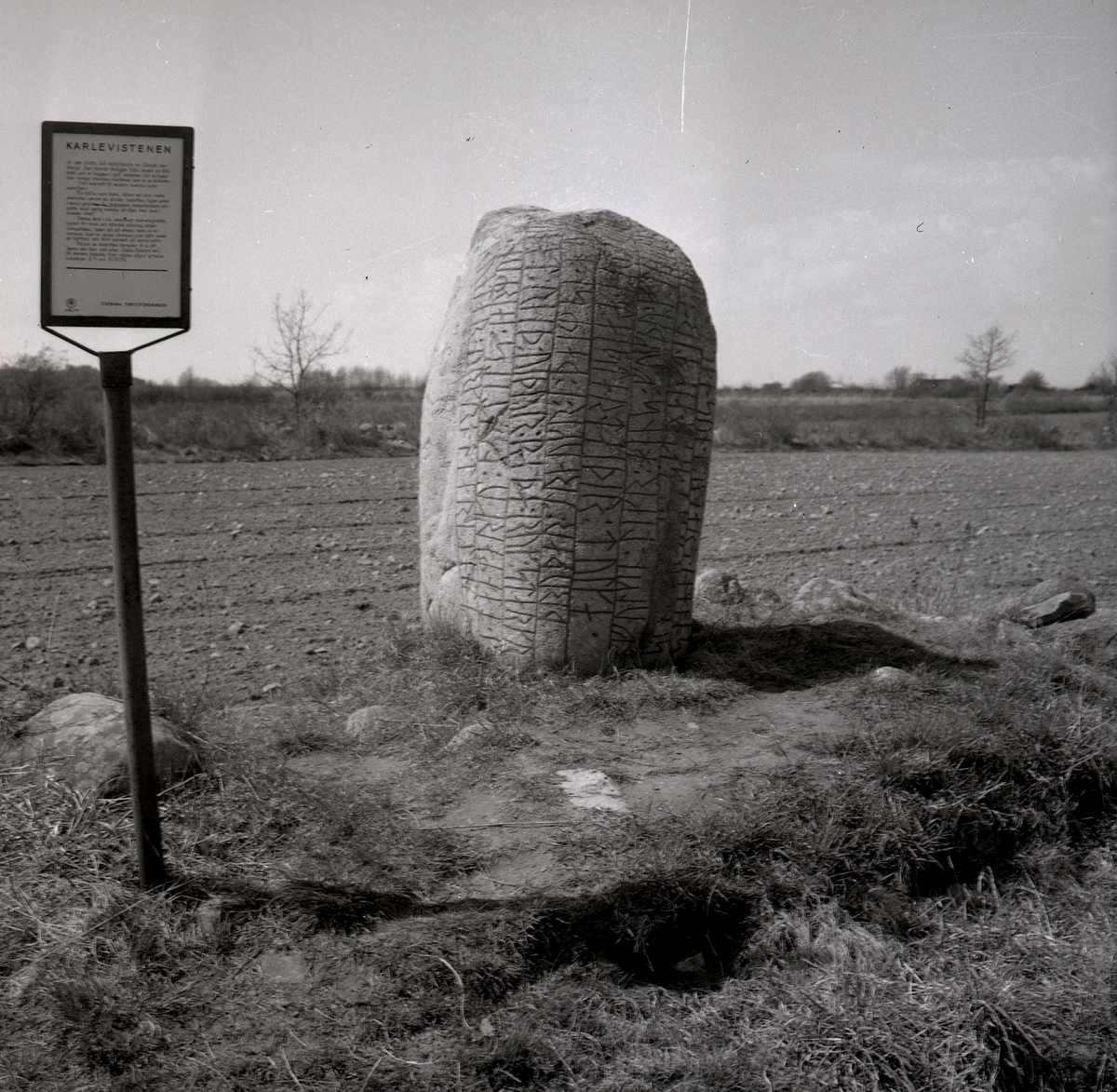 som i översättning lyder: "Dold ligger den som de största dåd följde, det visste de flesta, 'stridernas Truds arbetare' i denna hög. Ej skall en rättrådigare, kampstark 'Vagn-Vidur' på sjökonungens väldiga mark råda över land i Danmark."