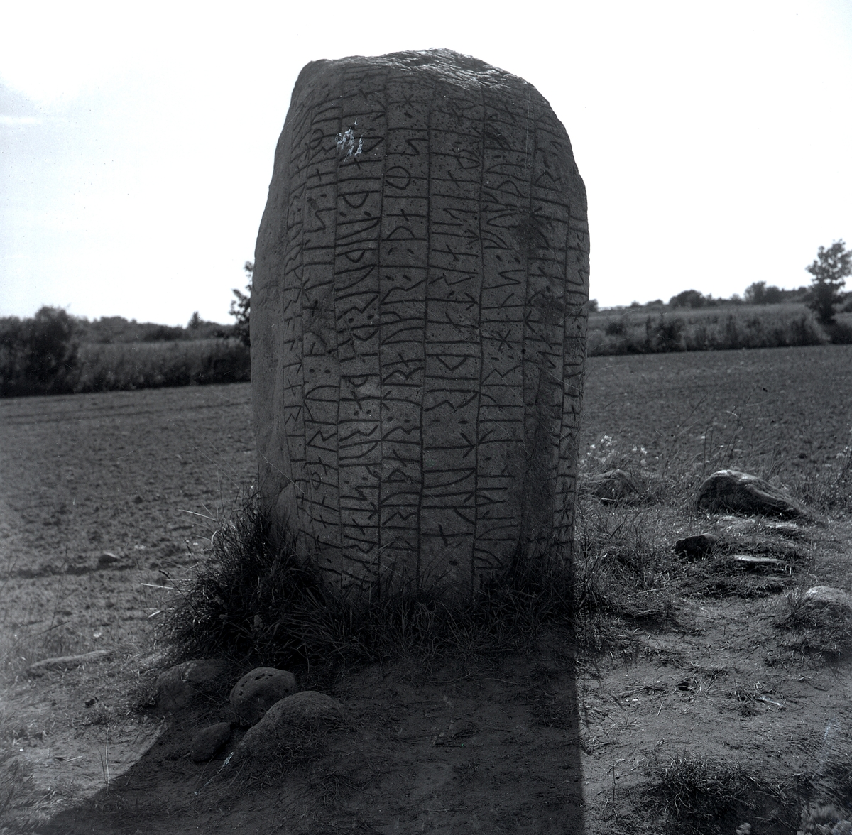 som i översättning lyder: "Dold ligger den som de största dåd följde, det visste de flesta, 'stridernas Truds arbetare' i denna hög. Ej skall en rättrådigare, kampstark 'Vagn-Vidur' på sjökonungens väldiga mark råda över land i Danmark."