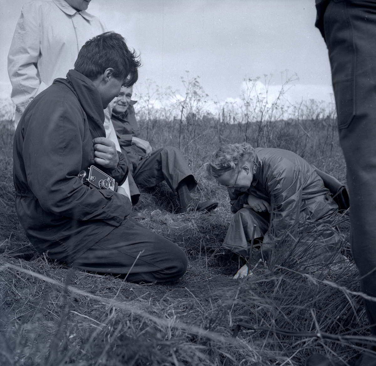 Ragnhild Boström och Ulf Erik Hagberg gör en arkeologisk undersökning på Kåreholm, juli 1962. Kåreholm är ön utanför Kårehamn.