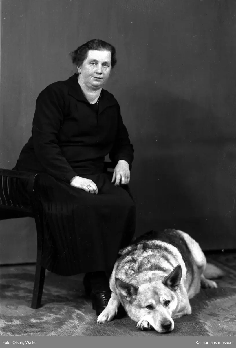 Ateljébild på en kvinna med hund. Enligt Walter Olsons journal är bilden beställd av fru N Johansson.