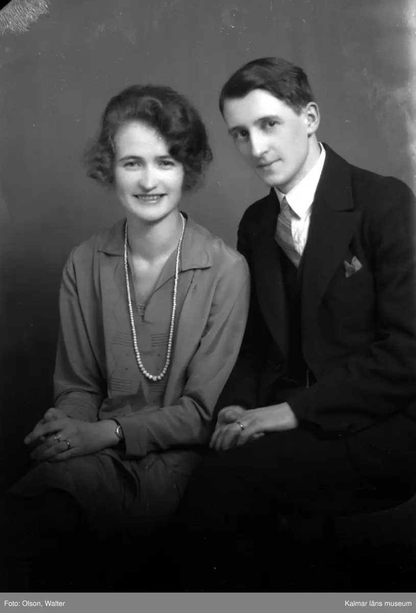 Ateljébild på en kvinna i klänning och halsband. Mannen har kostym. Enligt Walter Olsons journal är bilden beställd av fröken Greta Gustavsson.