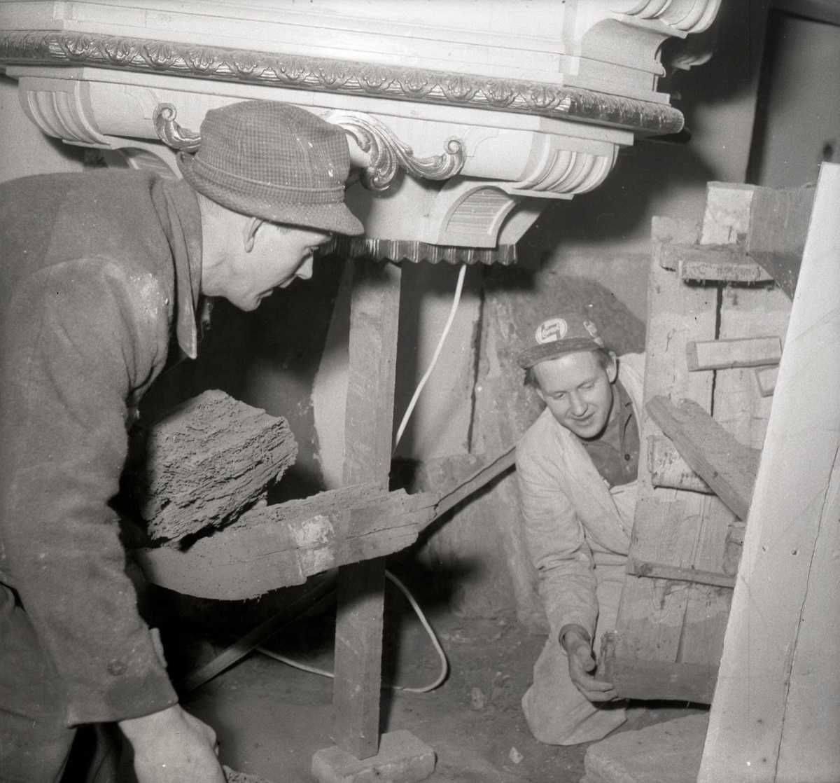 Värmeinstallatör utför arbete i Räpplinge kyrka 4/2 -1958.