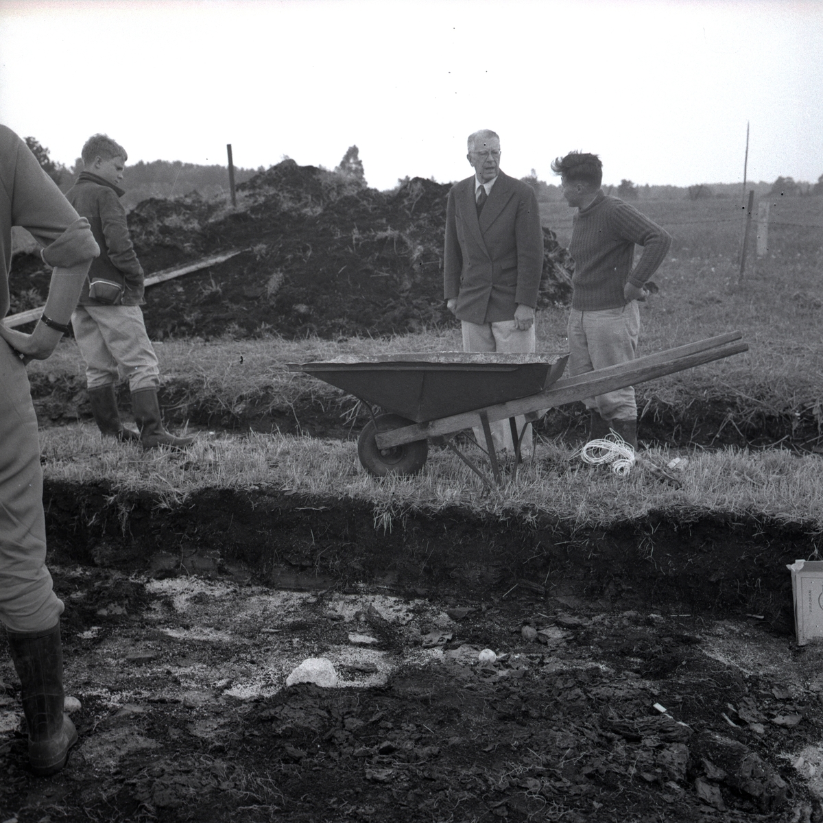 Kung Gustaf VI Adolf samt antikvarie Ulf Erik Hagberg vid utgrävningar i Skedemosse 9/7 1960.